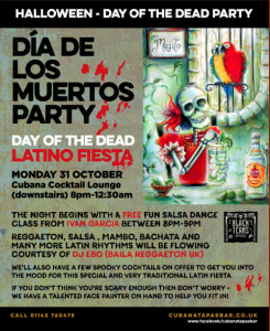 Dia de los Muertos – DAY OF THE DEAD LATINO FIESTA – 8pm-1.30amReggaeton, Salsa , Mambo, Bachata and many more Latin rhythms will be flowing courtesy of Havana’s own DJ Roly Caballero We’ll also have a few spooky cocktails on offer to get you into the mood for this special and very traditional Latin fiesta If you don’t think you’re scary enough then don’t worry – we have a talented face painter on hand to help you fit in