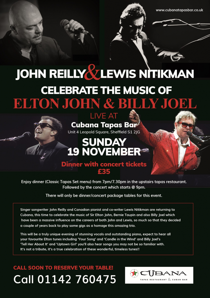 Singer songwriter John Reilly and Canadian pianist and co-writer Lewis Nitikman are returning to Cubana, this time to celebrate the music of Sir Elton John, Bernie Taupin and also Billy Joel. This will be a truly unique evening of stunning vocals and outstanding piano, expect to hear all your favourites in a true celebration of these wonderful, timeless tunes!!
