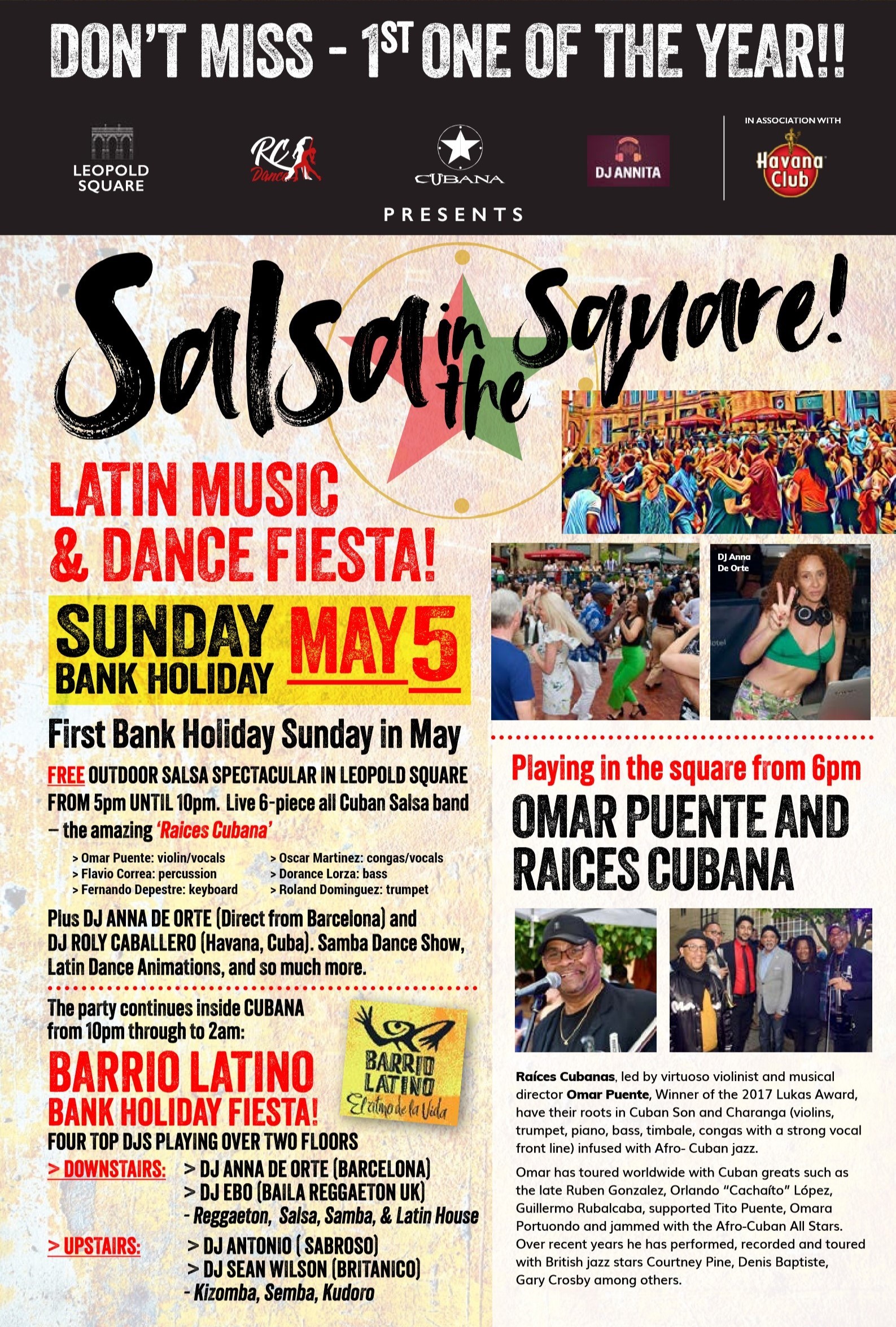 FREE OUTDOOR SALSA SPECTACULAR IN LEOPOLD SQUARE – FROM 5pm UNTIL 10pm. Live 6-piece all Cuban Salsa band – the amazing ‘Raices Cubana’