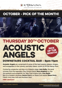 Downstairs Cocktail Bar – THE ACOUSTIC ANGELS Ð PICK OF THE MONTH Acoustic Angels are comprised of some of the best session players, singers and songwriters in the country and play classic covers to fill the dance floor.