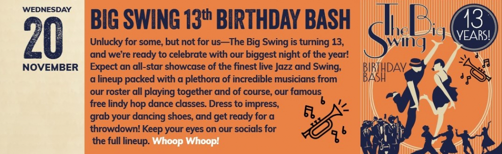 Unlucky for some, but not for us—The Big Swing is turning 13, and we’re ready to celebrate with our biggest night of the year! Expect an all-star showcase of the finest live Jazz and Swing, a lineup packed with a plethora of incredible musicians from our roster all playing together and of course, our famous free lindy hop dance classes. Dress to impress, grab your dancing shoes, and get ready for a throwdown! Keep your eyes on our socials for the full lineup. Whoop Whoop!